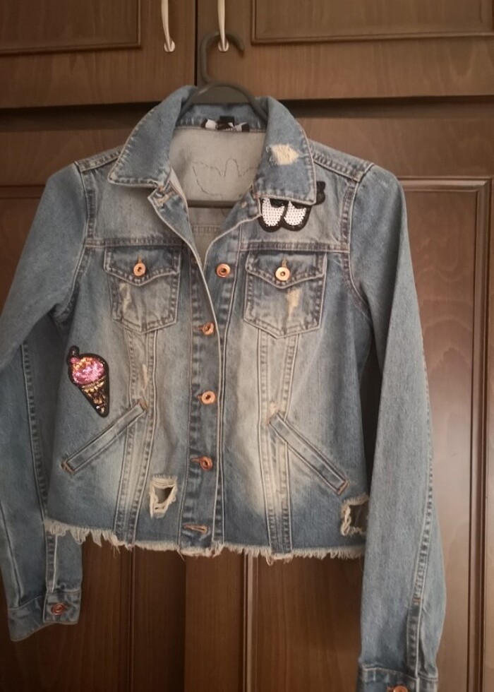 Çok yeni bir kere kullanılmış denim marka small beden taşlı yırtık detaylı kot ceket