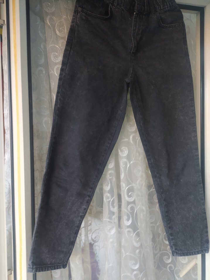 Gri renkte, kemerli ve bol kesim kot pantolon. Midi boyda, desensiz ve günlük rahat kullanıma uygun tarzda.