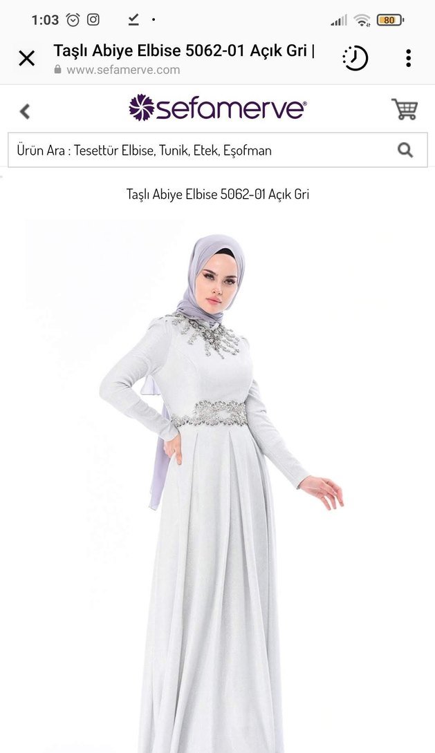 Uzun, bol kesim, yüksek yakalı ve uzun kollu bu abiye elbise, taş işlemeli ve drapeli detaylarla sade ve mütevazı bir şıklık sunar. Açık gri renktedir. iki kere tek giydim