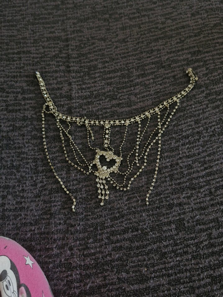 Koyu gri renkte, boncuklu ve nakışlı detaylara sahip kadın gövde zinciri. Gotik ve bohem tarzlara uygun, parti için ideal.