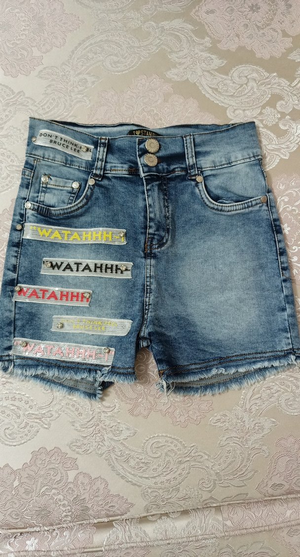 Mavi renkli, nakış detaylı ve düğmeli kız çocukları için dar kesim denim şort. Sokak modasına uygun rahat ve şık bir tasarım. Bedeni bilmiyorum, yaşı tahminen seçtim ölçüleri kontrol edin lutfen.Beden etiketini kesmisiz. Ölçüleri veriyorum ona göre bakabilirsiniz Düğme kapalı bel 70cm, arka uzunluk 37cm, ön uzunluk 33cm, kalça 76 cm