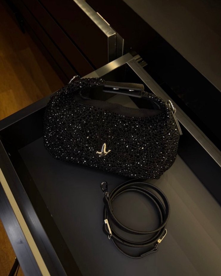 Siyah deri kadın çanta, payetli işlemelerle süslenmiş ve çıkarılabilir askıya sahip. Günlük kullanım için uygun ve şık bir model.