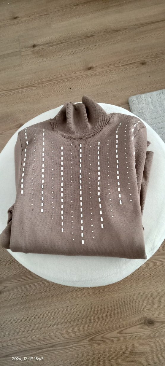 Vizon renkte, boğazlı ve uzun kollu kadın trikosudur. Oldukça kaliteli trikosu var günlük kullanıma uygun, dar kesim, Sadece 2 kez giydim.Yepyeni,esnek lkralı L bedenede rahatlıkla oluyor.
