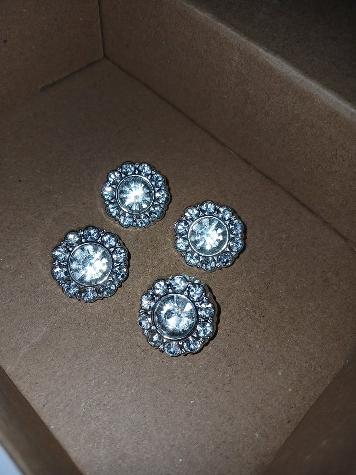 Taşlı Çiçek Formlu Gümüş Renk Düğme – 4’lü Set (Yeni) Şık ve zarif tasarıma sahip, taşlı çiçek formunda gümüş renk düğmeler. Hiç kullanılmamıştır, 4 adet set olarak satılmaktadır. Abiye, ceket, hırka, kaban, elbise ve tasarım ürünlerde rahatlıkla kullanılabilir. Taşları sağlam, parlak ve gösterişlidir. El işi ve özel tasarım sevenler için ideal ✨ Adet: 4’lü set Renk: Gümüş Durum: Yeni / kullanılmamış/kutulu #taşlıdüğme #çiçekdüğme #gümüşdüğme #düğmeseti #elisi #tasarım #abiyeaksesuar #terzi #kaban #ceket #elbisetasarım #butikürün