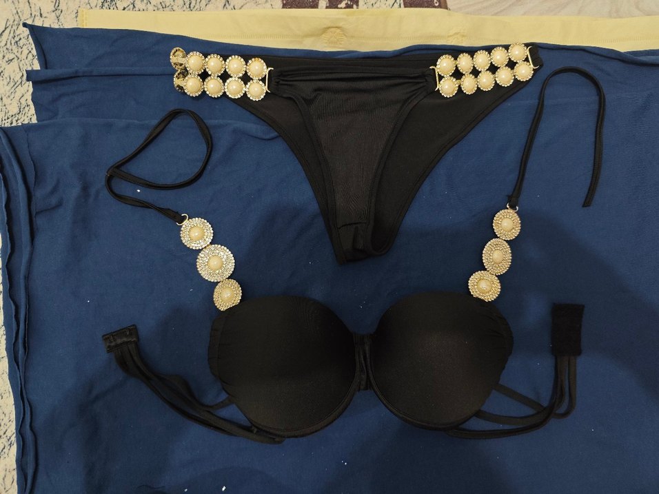 Taşlı detaylı askılı ve bel kısmı süslemeli siyah. Standart beden.