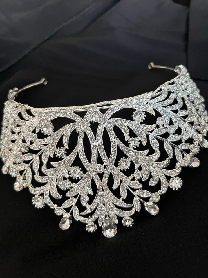 Gümüş renkte,Taş işlemeli ve Modern tarzda tasarlanmış bu düğün tacı, klasik zarafeti yansıtır. Gri tonlarda ince detaylara sahiptir. bir kez kulanildi Kararma yoktur.