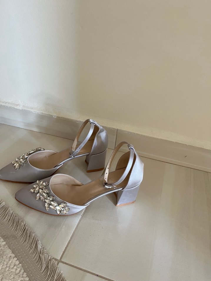 Taşlı Gümüş Kısa Topuklu Ayakkabı