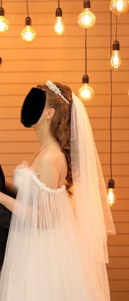 Beyaz ön kısmı kısa arka kısmı uzun incili düz fonlu gelin duvağı