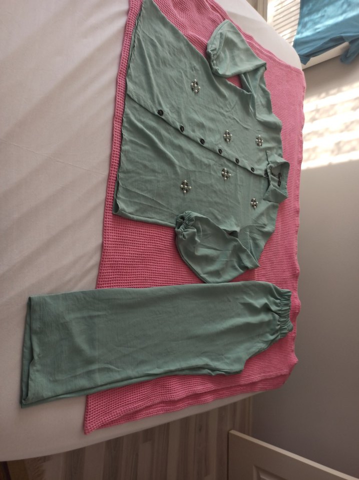 inci ve taş detaylı, uzun kollu, bol kesim pastel yeşil kadın alt üst takım rahat ve konforlu bir tarz sunar.