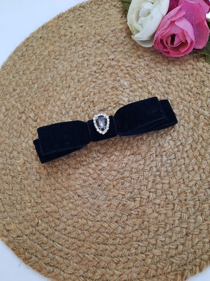 Küçük süs taşı detaylı siyah kadife fiyonk saç tokası, rahat ve vintage gotik tarz sunar.