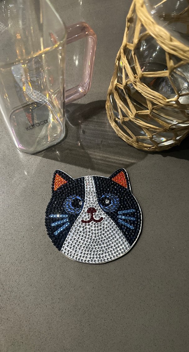 Mavi gözlü, turuncu kulaklı, ışıltılı taşlarla süslenmiş gri kedi figürlü bardak altlığı. İsteyene set olarak da verilebilir