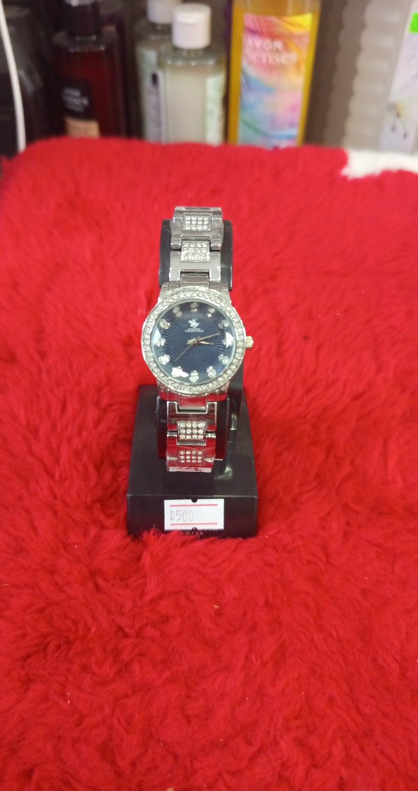 Mavi kadranlı ve taşlı detaylara sahip, kemerli metal kayışlı kadın kol saati. Glam ve rock punk tarzını yansıtıyor.