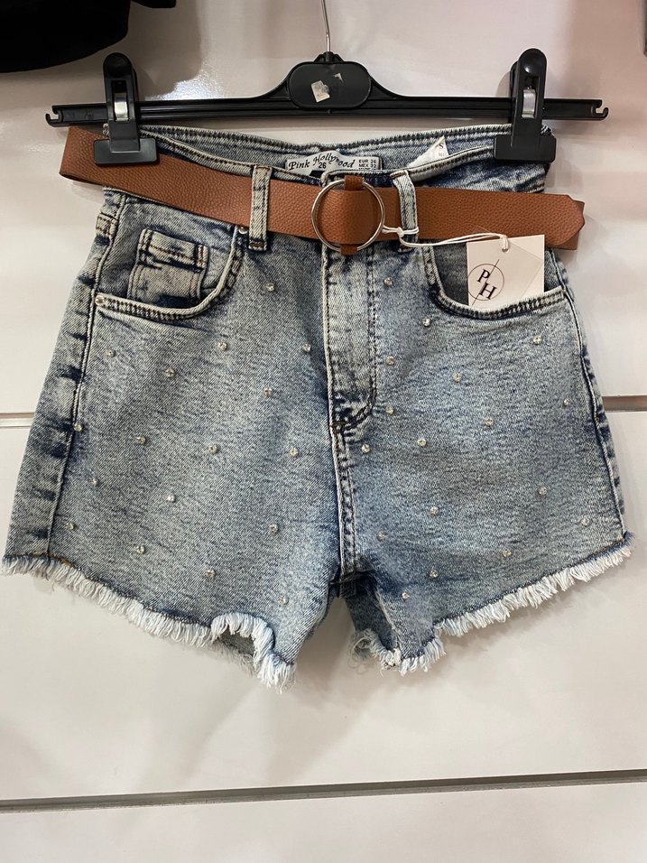 kot şort, taş detaylı. Kahverengi kemerle tamamlanmış, günlük rahat sokak stili için uygundur. Marka temsili
