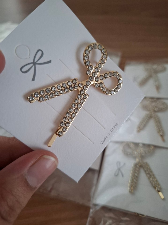 adet fiyatıdır toka olarak veya yaka broşu olarak kullanılabilir Altın renkli metalden yapılmış, taşlarla süslenmiş fiyonk şeklinde parıltılı saç tokası. Şık '&' tasarımı dikkat çekiyor. ✨