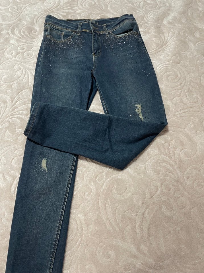 Mavi denim kumaştan, payet detaylı ve normal kesimde kadın kot pantolon. Günlük kullanıma uygundur.
