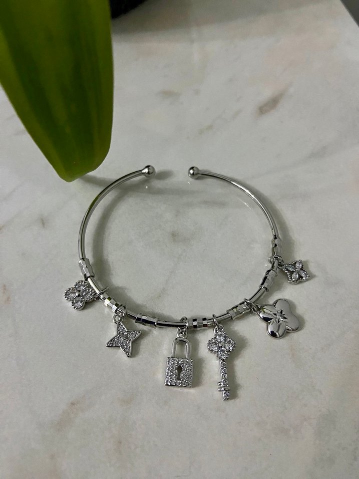 Taşlı ve beyaz boncuklu, kilit ve anahtar figürlü minimalist kadın bileklik. Günlük sokak stiline uygun şık bir aksesuar. ✨