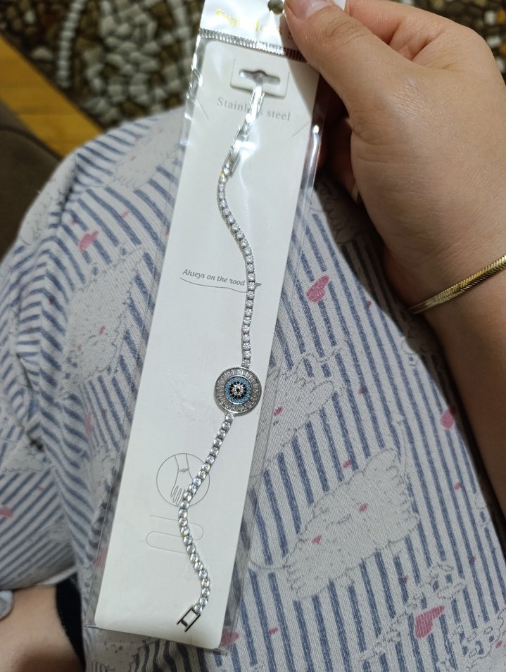 Gri zincir detaylı kadın bileklik, ortasında göz motifi bulunur. Minimalist ve bohem tarzda günlük kullanım için uygundur.