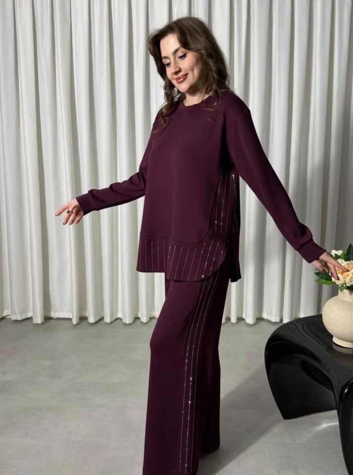 mor renkli, uzun kollu ve oysho modal kumaştan yapılmış kadın takımı. Regular fit, drapeli kesim ve taş detayları ile günlük kullanıma uygundur.