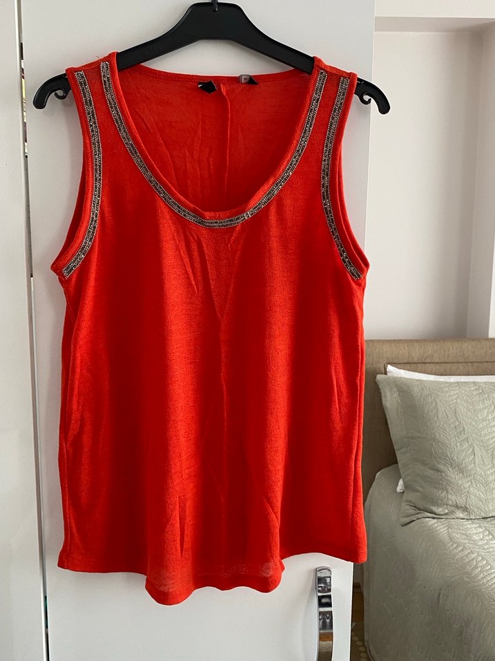 Hiç giyilmemiştir. Kırmızı, kolsuz ve salaş kesim bluz. Yakası ve kol oyuntuları nakışlı, orta boy uzunlukta, yumuşak dokulu kumaştan yapılmıştır.