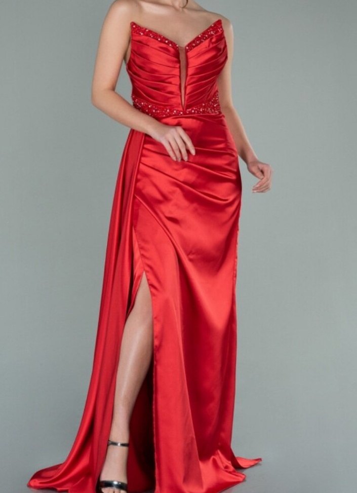 Drapeli tasarıma sahip, V yaka ve ince askılı kırmızı uzun abiye elbise. İşlemeli detaylar ve parlak kumaşla düğünler için uygundur. Kendi görselleri duruşunu istediğinizde ekleyebilirim sorunsuz bir elbisedir kendi vücuduma göre yaptırdım 40 kilo üstüne olacağını sanmıyorum