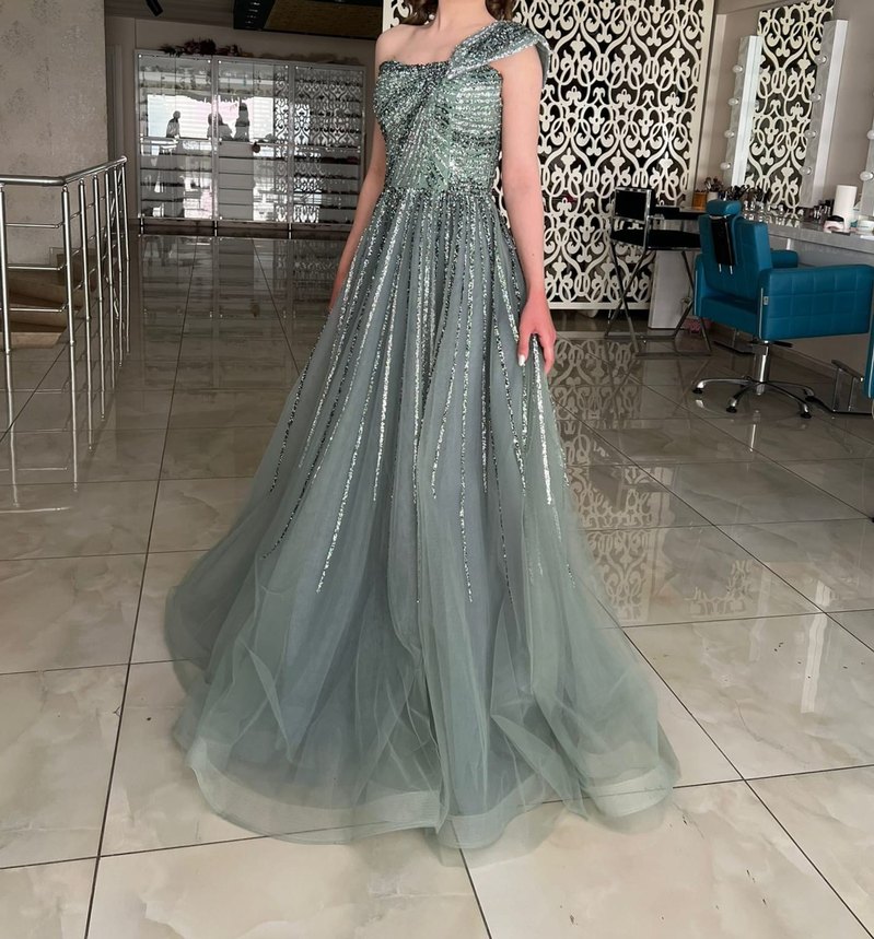 Nakış işlemeli, askısız ve drapeli su yeşili abiye elbise, klasik şıklık ve çağdaş tarz sunar. Kol kısmı kolsuzdur ve vücuda oturur.Lütfen ölçü sorup satın alınız.
