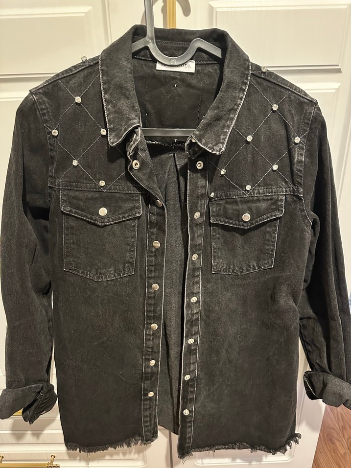 Marka temsili.Düğmeli ön kısımlı siyah denim ceket, uzun kollu ve kırçıllı görünüme sahip. Omuzlarda ince zımba detayları ve iki cep var. Midi boy, rahat kesim ve salaş stil sunar. #zara #mango