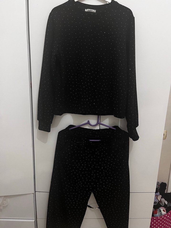 Taş detaylarla süslenmiş, uzun kollu ve bisiklet yaka siyah kadın eşofman takımı. Rahat kesim eşofman takımı L bedendir 40-42 için uygundur hiçbir defosu yoktur paçalarına terzilik yapılmıştır alt eşofmanın beli lastiklidir
