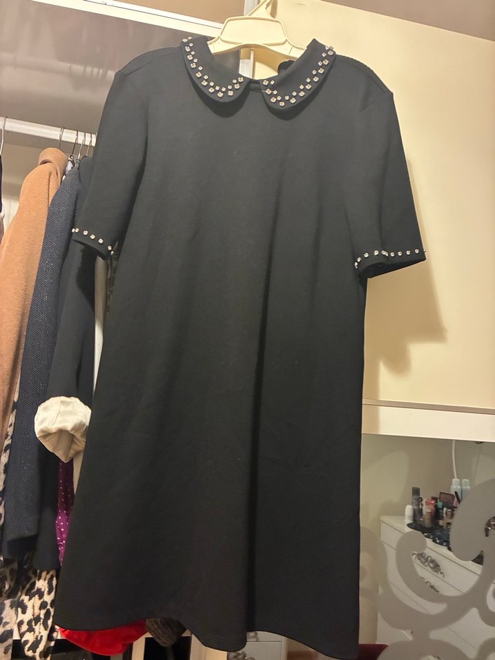 Taşlı yakalı ve kısa kollu siyah midi elbise, ofis kullanımı için rahat ve şık bir seçenek.