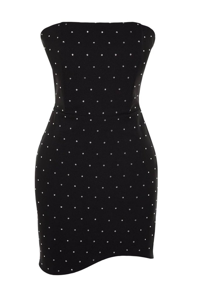 Taşlı puantiyeli siyah straplez midi kalem elbise, ince sentetik kumaştan, gösterişli gotik tarzda romantik akşamlar için uygundur. 1 taş eksiktir.
