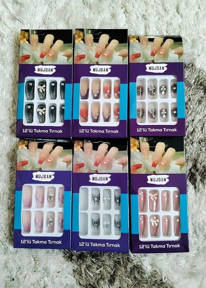 6 çeşit taşlı Takma Tırnak. Kendinden yapışkanlı 12 parça takma tırnak ve içerisinde 12 parça sticker mevcuttur. Toplu alımlarda fırçalı tırnak yapıştırıcı hediye olarak gönderilmektedir. Adet fiyatıdır.