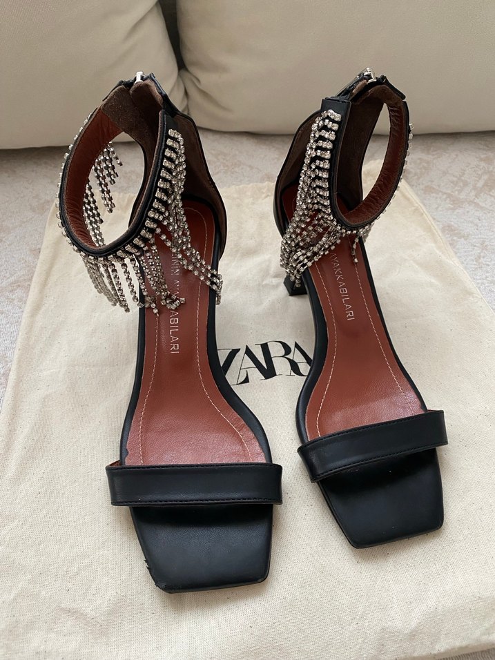 Zincir detaylı siyah deri blok topuklu ayakkabılar, çağdaş baskılı tasarıma sahip. Romantik akşamlar için uygun.