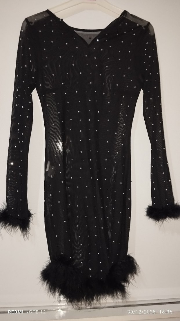 Bu siyah gece elbisesi, uzun kollu ve V yakalı olup, manşetlerde ve etek ucunda kürk detaylara sahiptir. Desenli ve fit kesimdir, partiler için göz alıcı goth tarzı sunar.