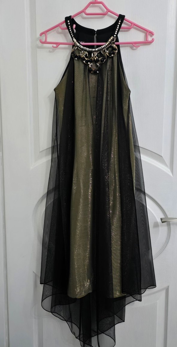 Taş ve boncuk işlemeli tül kaplı abiye elbise. İçi parlak altın sarısı kumaş üzerine geniş tül kaplı bir elbise. Çok şık ve rahattır. Likralı esnek kumaştır. S M L bedenlere uyar.