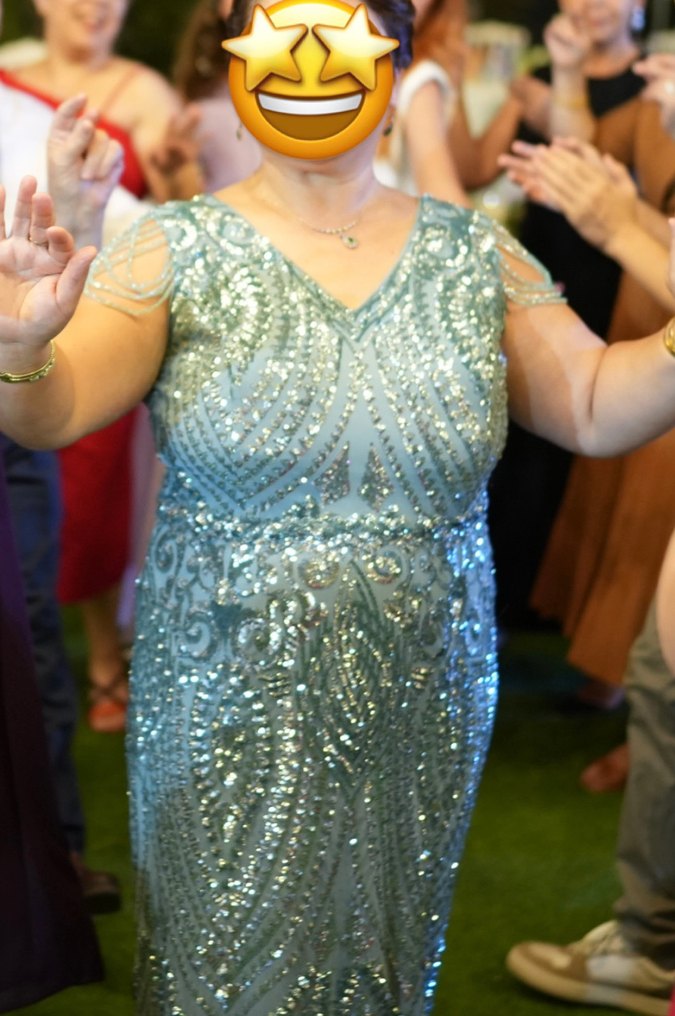 V yaka, taş kol detaylı ve taşlı turkuaz abiye elbise, uzun boyda ve vücuda oturan kesime sahiptir. 90 kilo, 165 cm boyunda bir kez sadece düğünde giyildi, hiçbir sorunu yoktur. Taşlarında dahi dökülme olmadı. Daha fotoğraf isterseniz ekleyebilirim