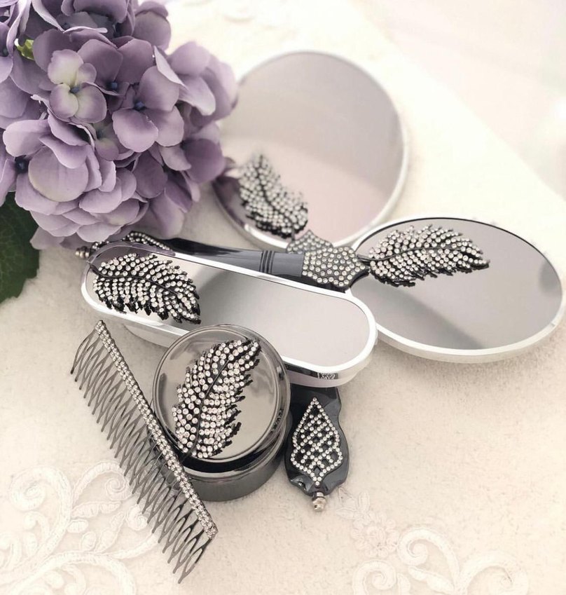 Bu saç bakım seti, taşlı tüy desenli tarak, fırça ve aynadan oluşur. Şık kutusunda kullanışlı ve dekoratiftir. ✨
