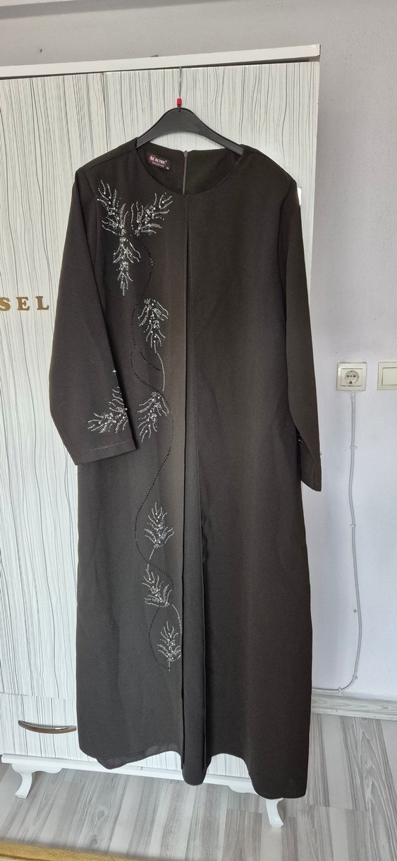 Haki yeşili uzun elbise, yakalı ve uzun kollu. Bol kesim, taşlı geniş kalıp bi kere kınada giyildi hiçbi deformesi yok ihtiyaç fazlası olduğu için satıyorum 100 kiloda giyildi 54 bedendir ürün boyu 140 cm