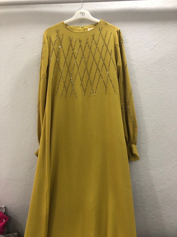 Yağ yeşili renkte, uzun kol ve yuvarlak yakalı, salaş kesim, taşlı ve drapeli detaylara sahip uzun kadın abiye. Parlak sentetik kumaştan üretilmiştir.