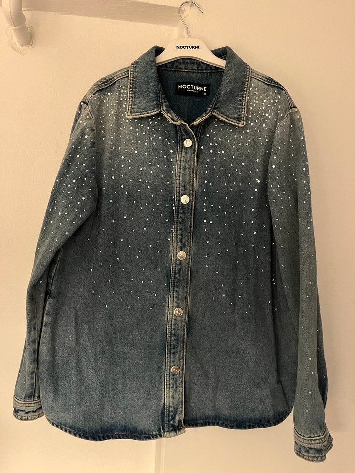 Mavi renkli taşlı, düğmeli, uzun kollu ve normal uzunlukta bol kesim kadın denim ceket. Parlak detaylarla süslenmiş, günlük rahat kullanıma uygun sokak stili ceket.