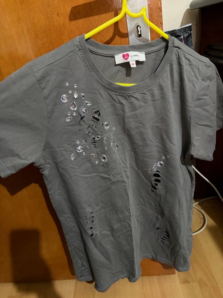 Gri, taşlı, yırtık detaylı, kısa kollu tişört. Bol kesim ve yuvarlak yaka, baskılı detaylara sahip, yumuşak sentetik kumaştan günlük kullanım için uygundur.