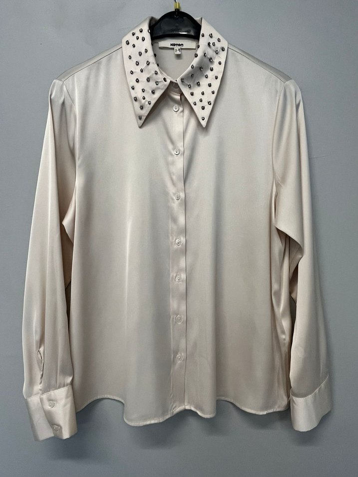 Taşlı yakası, düğmeli önü ve uzun kollu, bol kesim, saten kumaştan bej kadın gömleği. Ofis ve günlük kullanım için uygundur. ✨ Hiç kullanılmadı her beden mevcut