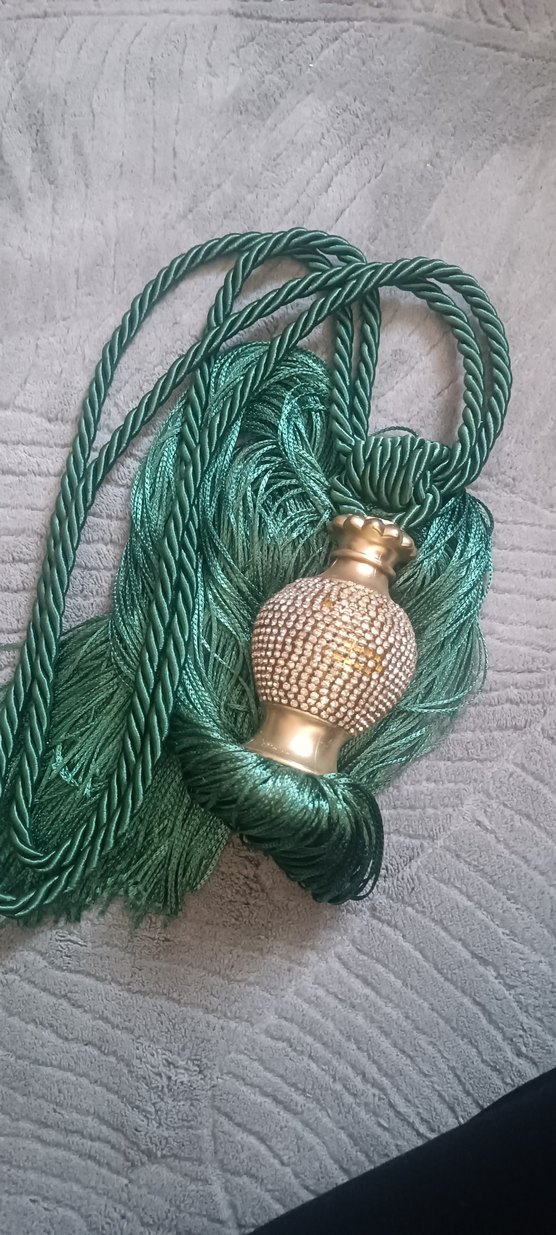Yeşil Perde Bağı bohem tarzı ve lüks evlere uygun. Altın ve taş süslemeli detaylarla dekoratif bir dokunuş sağlar.