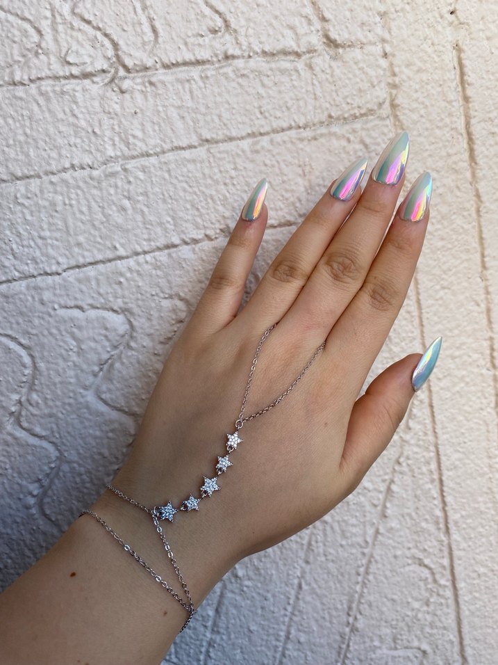 Pul işlemeli yıldız detaylı, çok renkli tie-dye desenli bohem tarzda el zinciri, günlük kullanıma uygun şık bir aksesuar. ✨