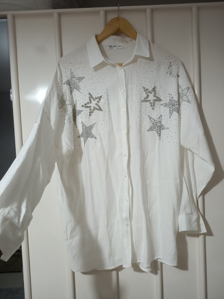 Saloon Taşlı Yıldız Detaylı Oversize Beyaz Gömlek – Yeni ✨ Durum: ✔️ Sıfır / Hiç kullanılmadı ✔️ Temiz ve kusursuz Marka: Saloon Kalıp: Oversize (rahat ve salaş duruş) Beden: Etiket yok – Ölçülere göre alım önerilir Ölçüler: İki kol arası: 72 cm Omuzdan boy: 76 cm Kol boyu: 38,5 cm Alt etek genişliği: 60 cm Kumaş İçeriği: %40 Polyester %40 Viskon % Özellikler: ✨ Ön kısmında taşlı yıldız ve pul detayları ✨ Şık ve modern tasarım ✨ Kolları düğmeli, kıvırarak kısa kollu kullanılabilir ✨ Hem günlük hem özel gün kombinlerine uygundur ✨ Beyaz rengiyle her parçayla kolay kombinlenir Oversize yapısı sayesinde S–XL arası bedenlere uygundur. Hızlı kargo – özenli paketleme yapılır.#saloon #beyazgömlek #oversizegömlek #taşlıgömlek #şıkbluz #kadıngiyim #kombinönerisi #moda #trendparçaGünlük kullanımda spor-şık, akşam kombinlerinde ise oldukça zarif duran özel bir parça ✨