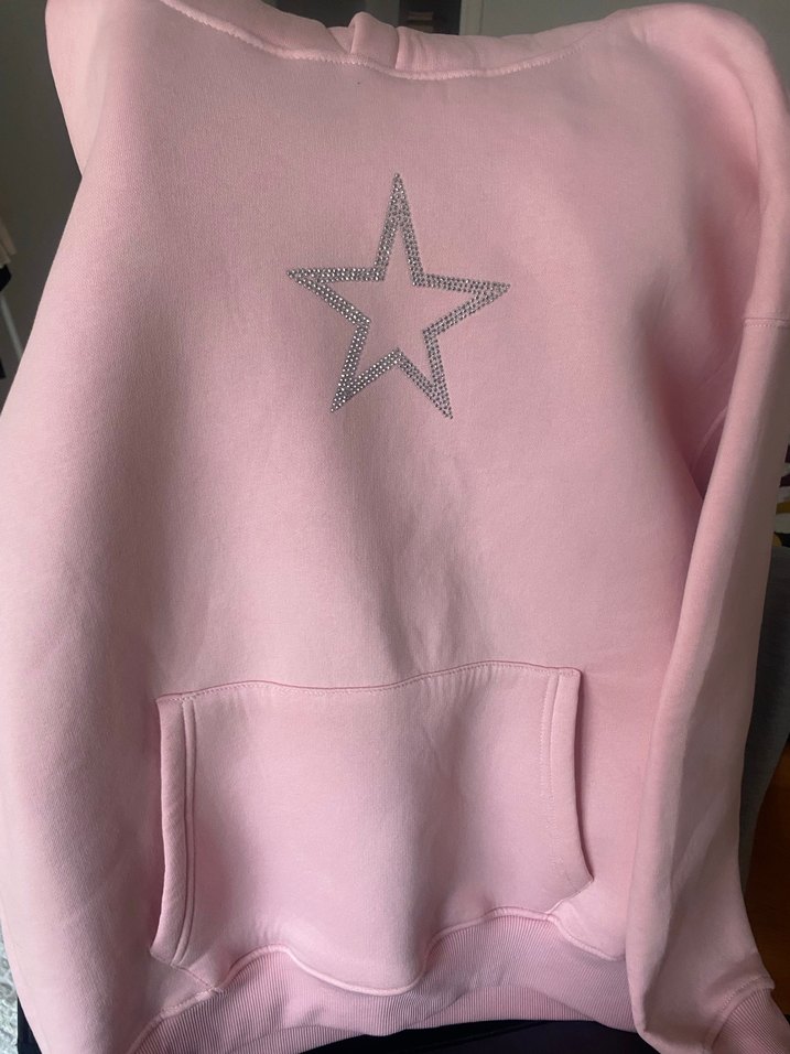 Pembe renkli kadın sweatshirtü, uzun kollu ve yuvarlak yaka kapşonlu tasarıma sahiptir. bol kesimdir. Ön kısmında parlak pul işlemeli yıldız detayı bulunur. Önde cep mevcuttur, günlük kullanıma uygundur. Hiç giyilmedi etiketli