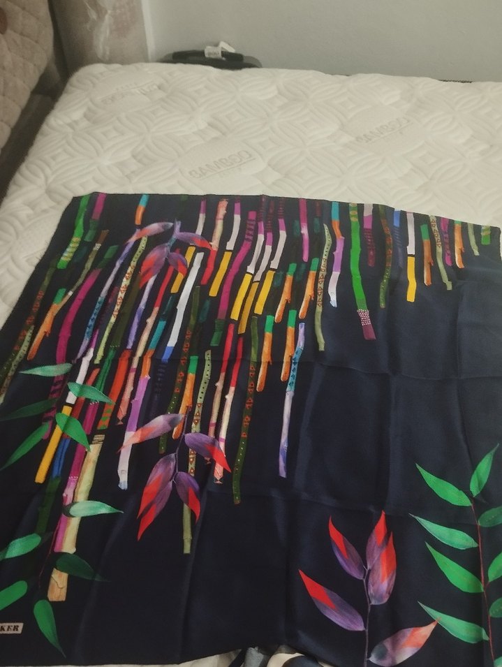 Tasselli, çok renkli, koyu canlı bohem desenli kadın ipek şalı, AKER etiketiyle.