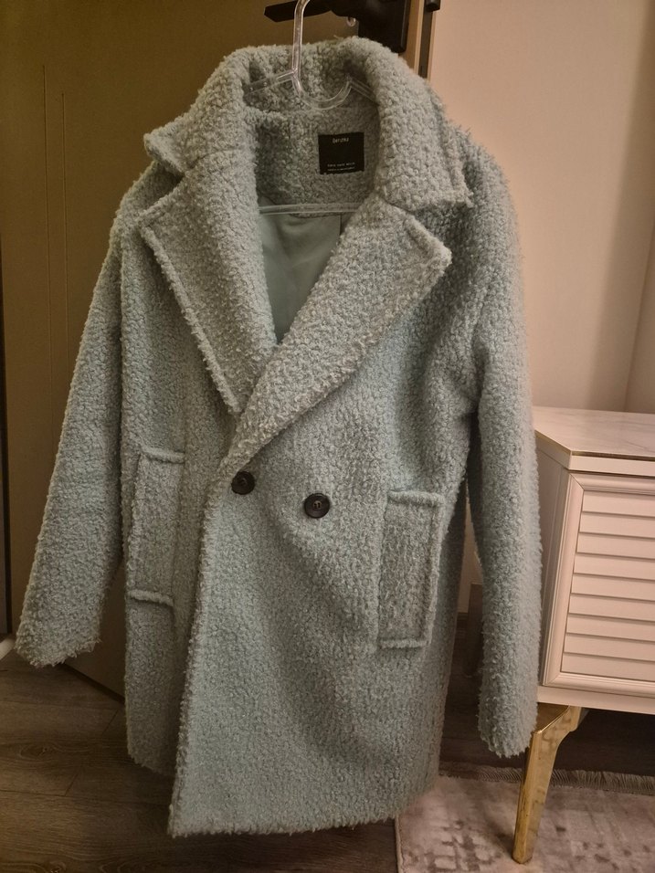 , düğmeli ve kesik yakalı midi uzunlukta kadın kaban. Yumuşak tüylü kumaştan, bol kesim ve uzun kollu, günlük rahat sokak stili için uygun.