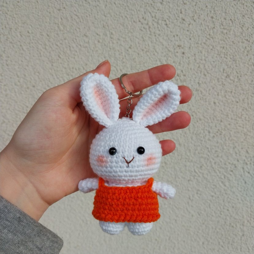 Turuncu kıyafetli, el örgüsü beyaz tavşan peluş anahtarlık. Yumuşak dokusu ve sevimli tasarımıyla dikkat çeker.