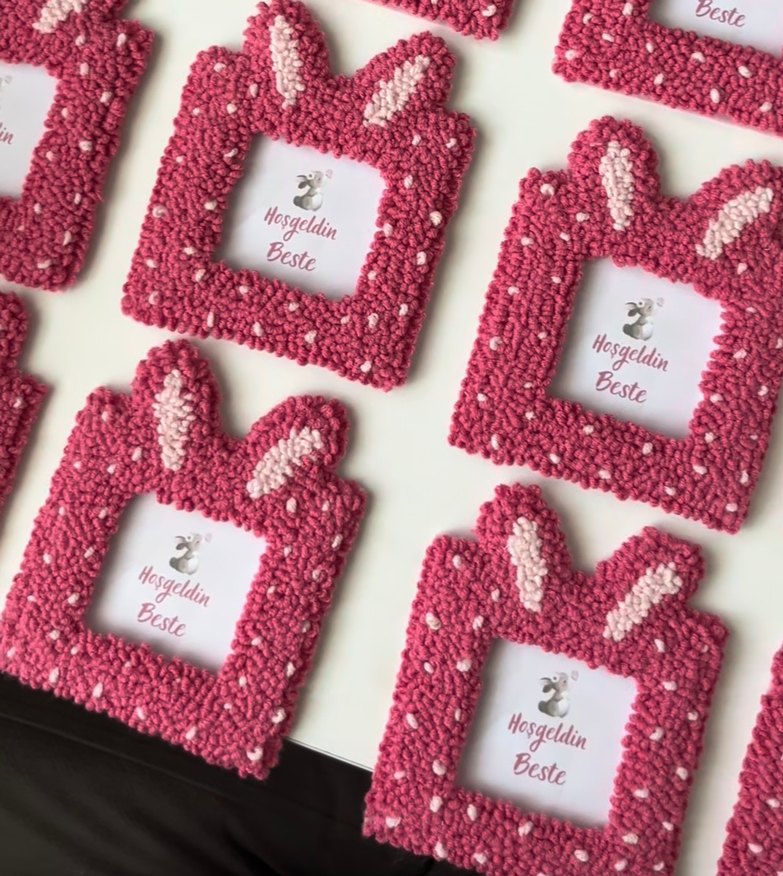 Pembe bohem tarzda, dokulu tavşan kulaklı çerçeveler, üzerinde "Hoşgeldin Beste" yazısı bulunuyor.Hediyelik dağıtmalık istediğiniz renk yapılır