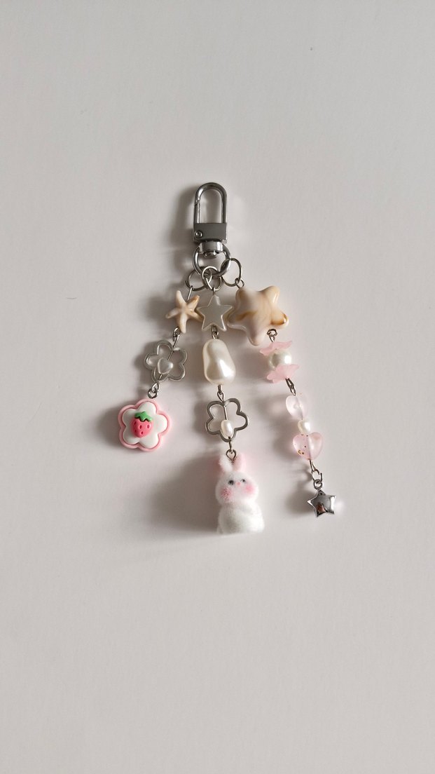 Yıldız, çiçek, çilek ve küçük tavşan figürlü pastel pembe boncuklu anahtarlık, Parisli rock punk havasında. ürün kendi el emeğim ile uretilmekte umarim begenirsiniz