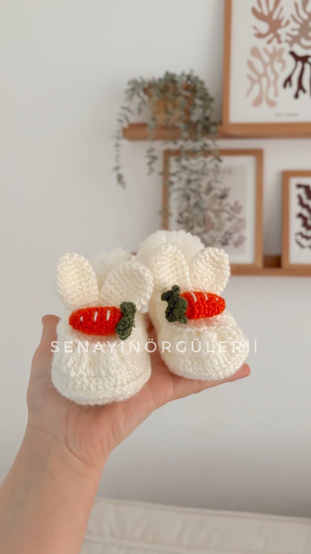 Nakışlı havuç detaylı beyaz örgü kız bebek patik. Yumuşak örgü kumaştan, sade ve klasik tarzda.